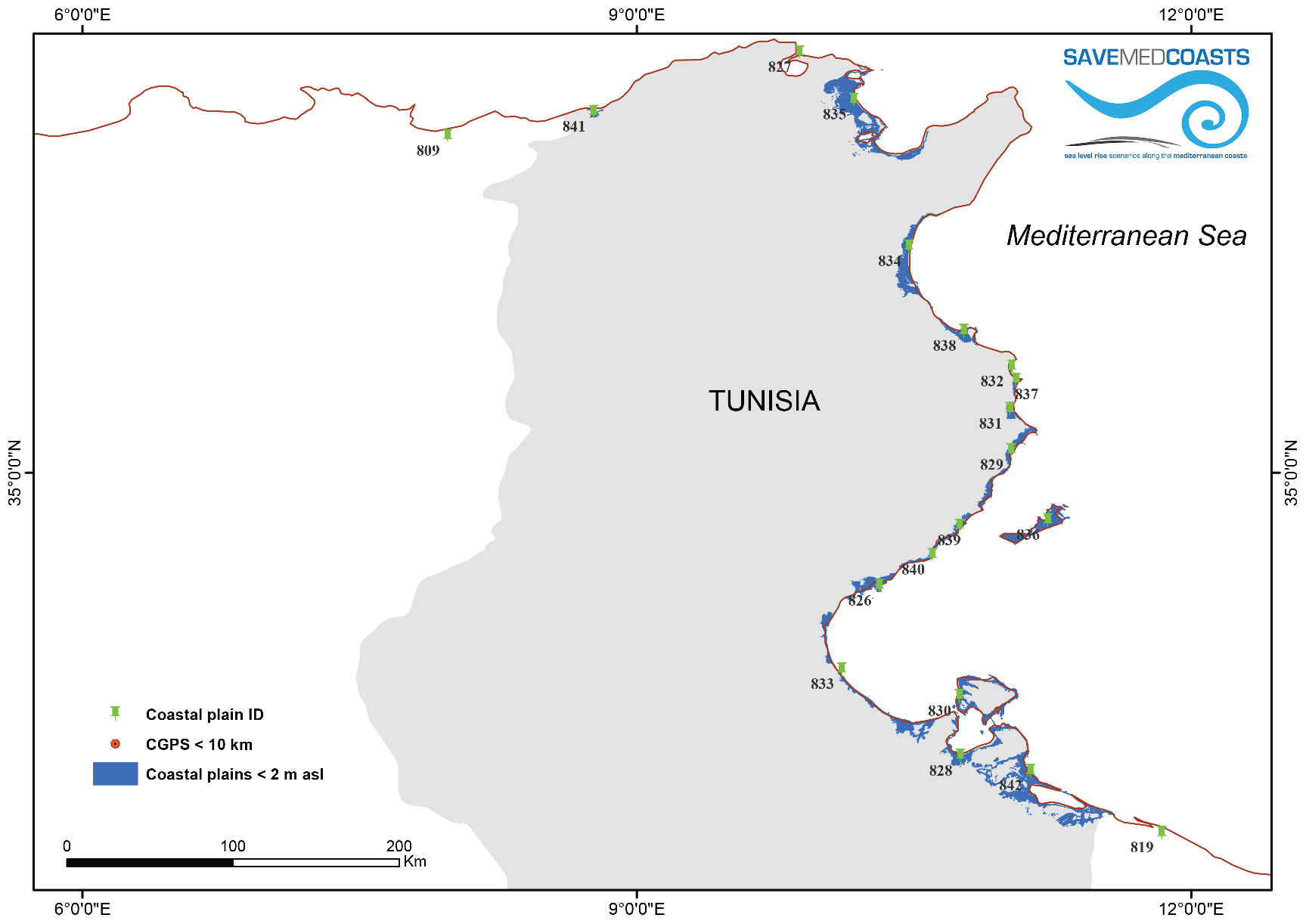 - Tunisia (ID 800): map of coastal plains prone to marine flooding